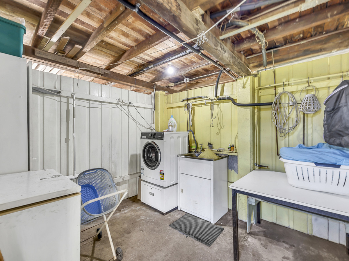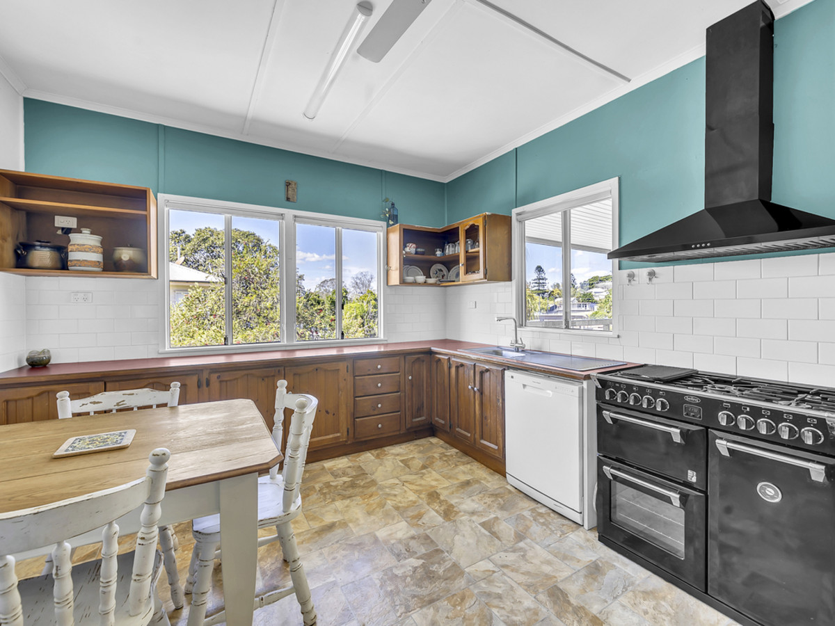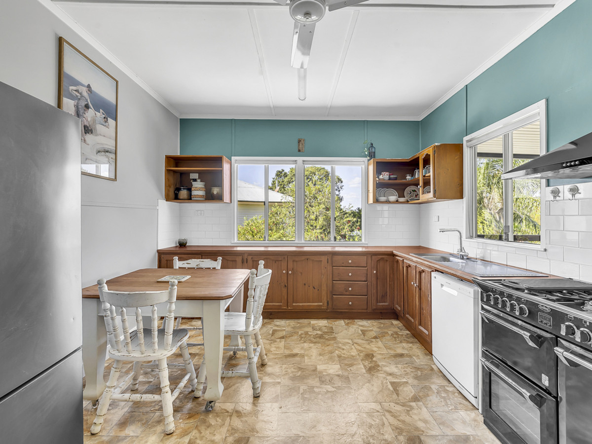 The spacious living area is fitted with both an air conditioner and ceiling fan, providing year-round comfort. The kitchen and adjoining eat-in dining area are a true highlight, boasting generous bench and cupboard space, a dishwasher, a Belling five-burner gas stove with electric oven and grand rangehood, plus a walk-in pantry. Inside, you’ll also find stunning high ceilings, polished timber floors, and classic casement windows that add timeless charm.
