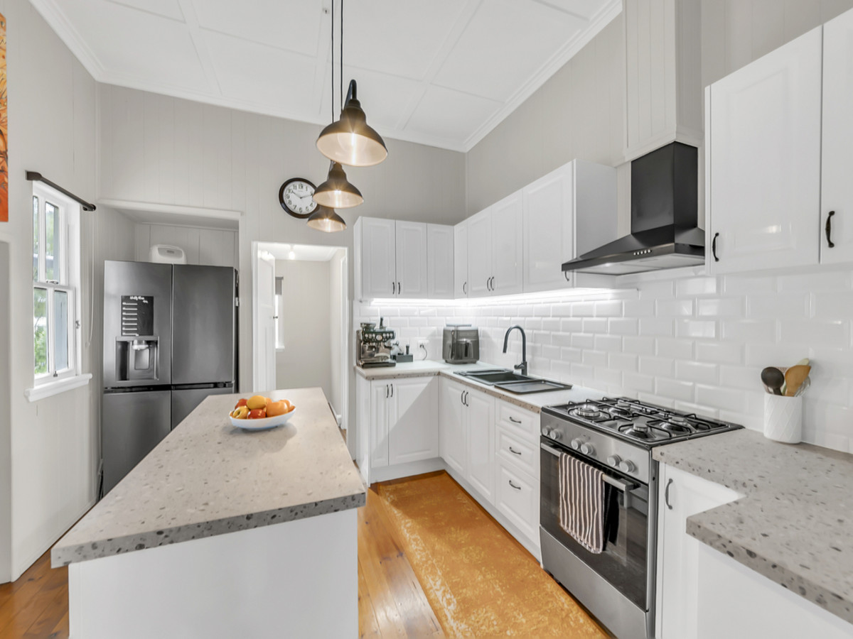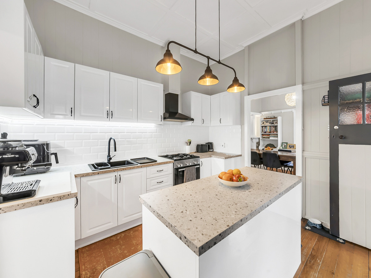 The kitchen is a standout, recently renovated with an eye for both beauty and function. An island bench with pendant lights takes centre stage, surrounded by abundant storage, a gas stove, dishwasher, LED strip lighting and dual access to the outdoors – perfect for entertaining. The bathroom, though compact, is cleverly designed with a shower-over-bath, vanity and toilet, while a study nook nearby offers a peaceful spot to work or create.