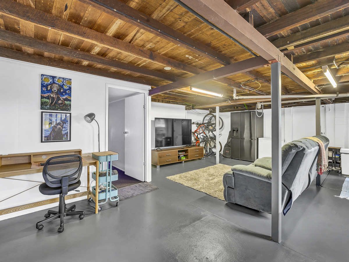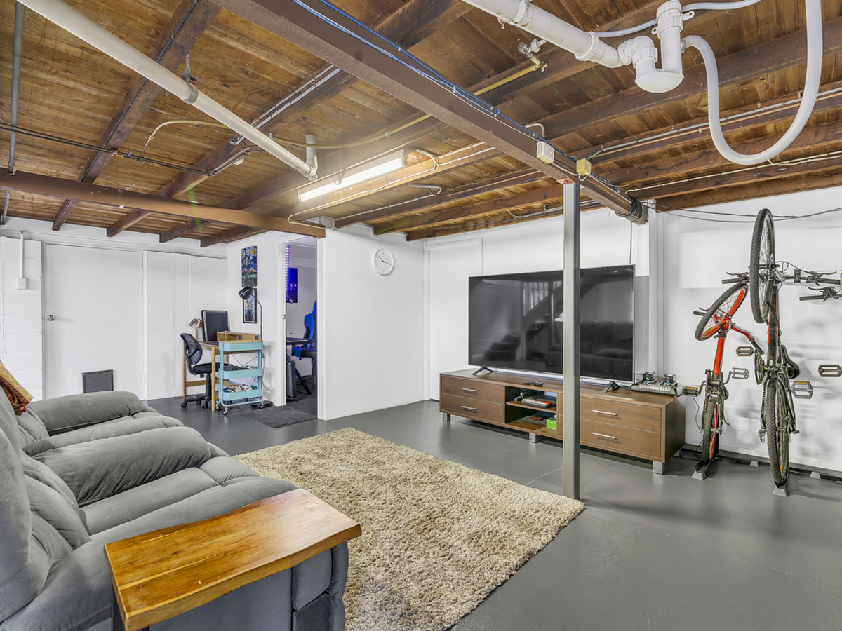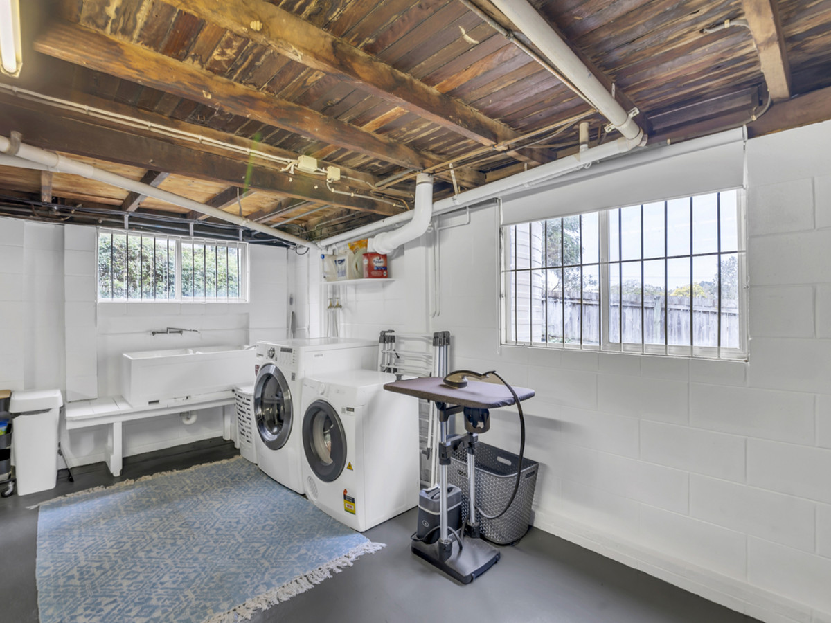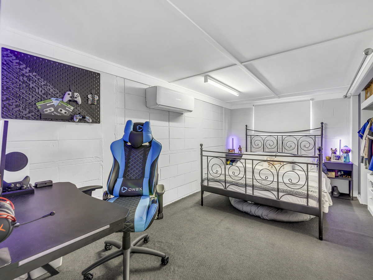 Both bedrooms are spacious, with carpet underfoot, ceiling fans, air-conditioning and freestanding wardrobes. Each opens through French doors to the polished-floor sunroom – a light-filled retreat perfect for morning coffee or quiet afternoons. From here, internal stairs lead to a versatile downstairs area with a multipurpose room, a huge rumpus, storage and laundry, plus two separate exits to the outside.