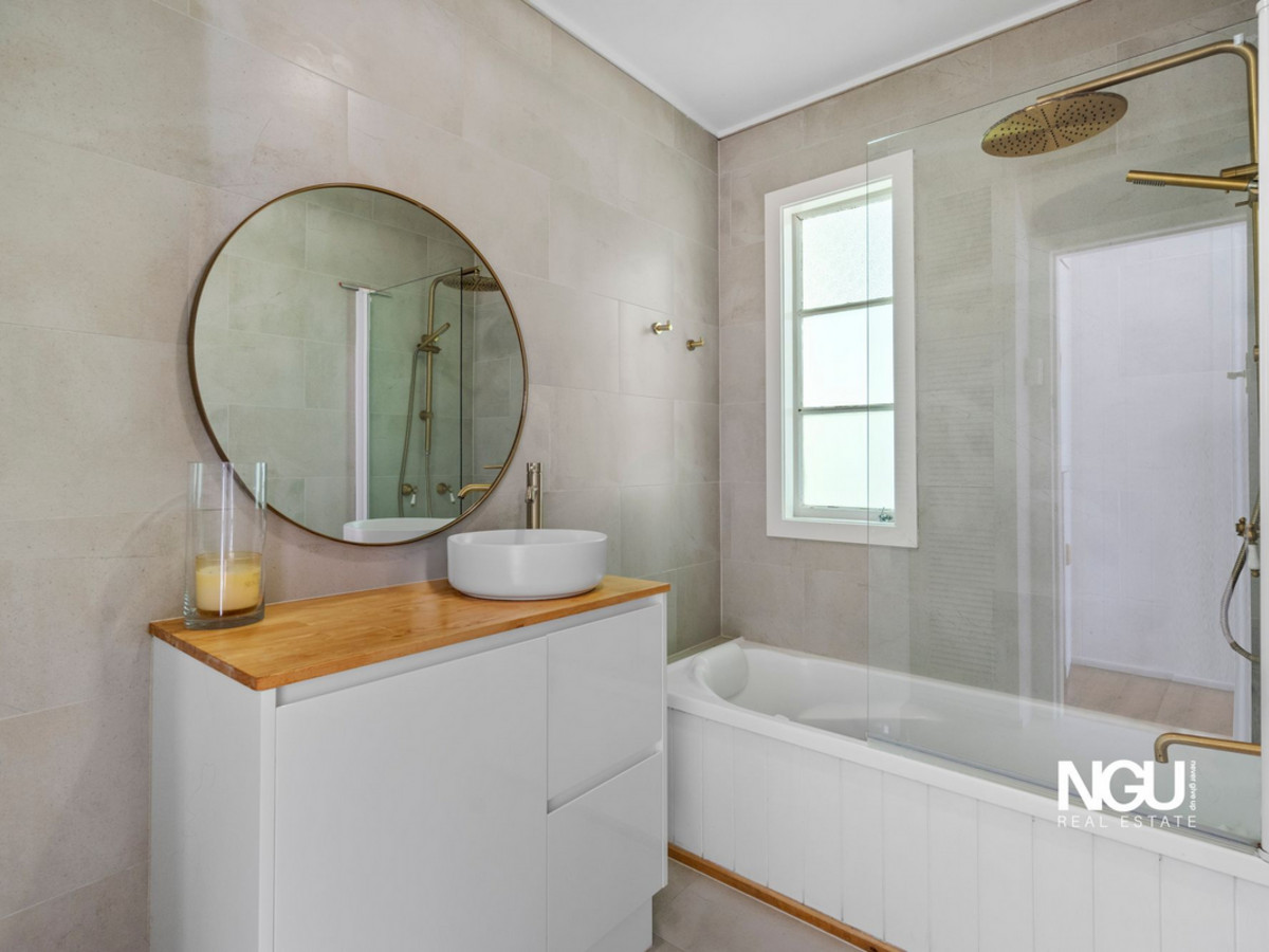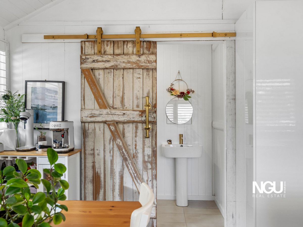 The family bathroom has been beautifully renovated, boasting floor-to-ceiling tiling, a timber benchtop vanity, and matching brass fittings that echo the home’s refined palette. A separate powder room off the dining area, accessed through a beautiful barn door with a striking brass handle and runner, provides additional convenience for guests and continues the home’s cohesive use of elegant brass accents throughout.