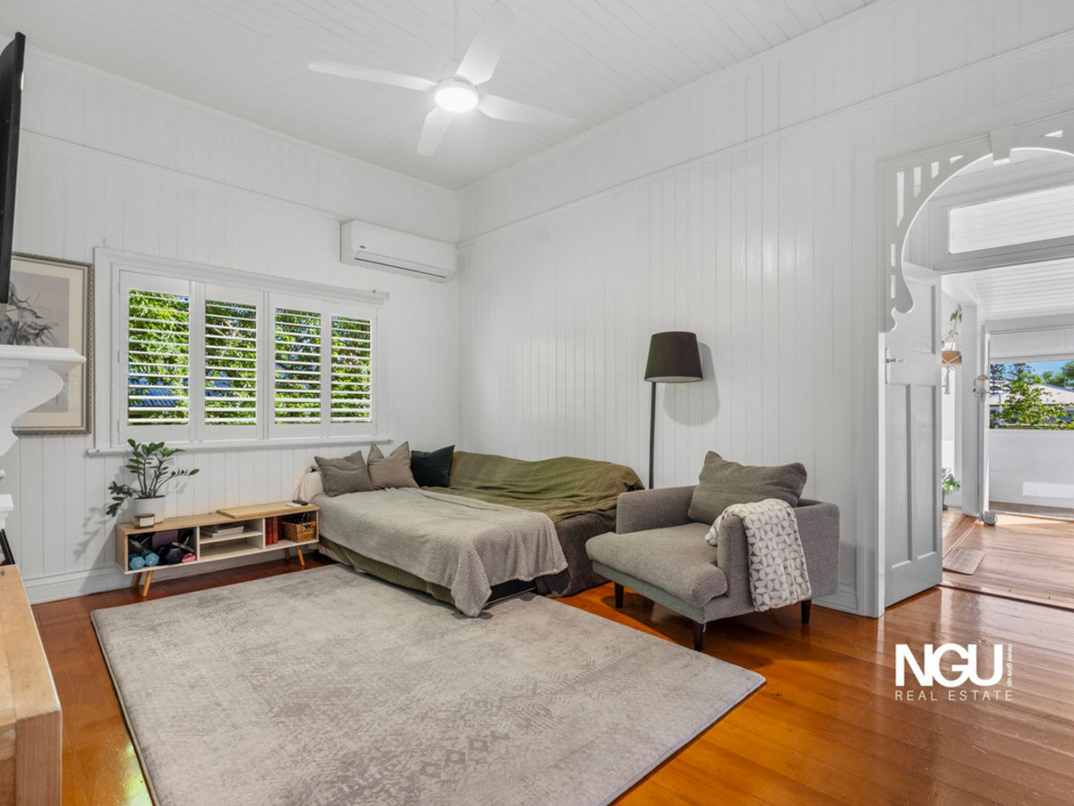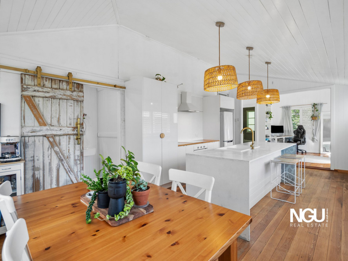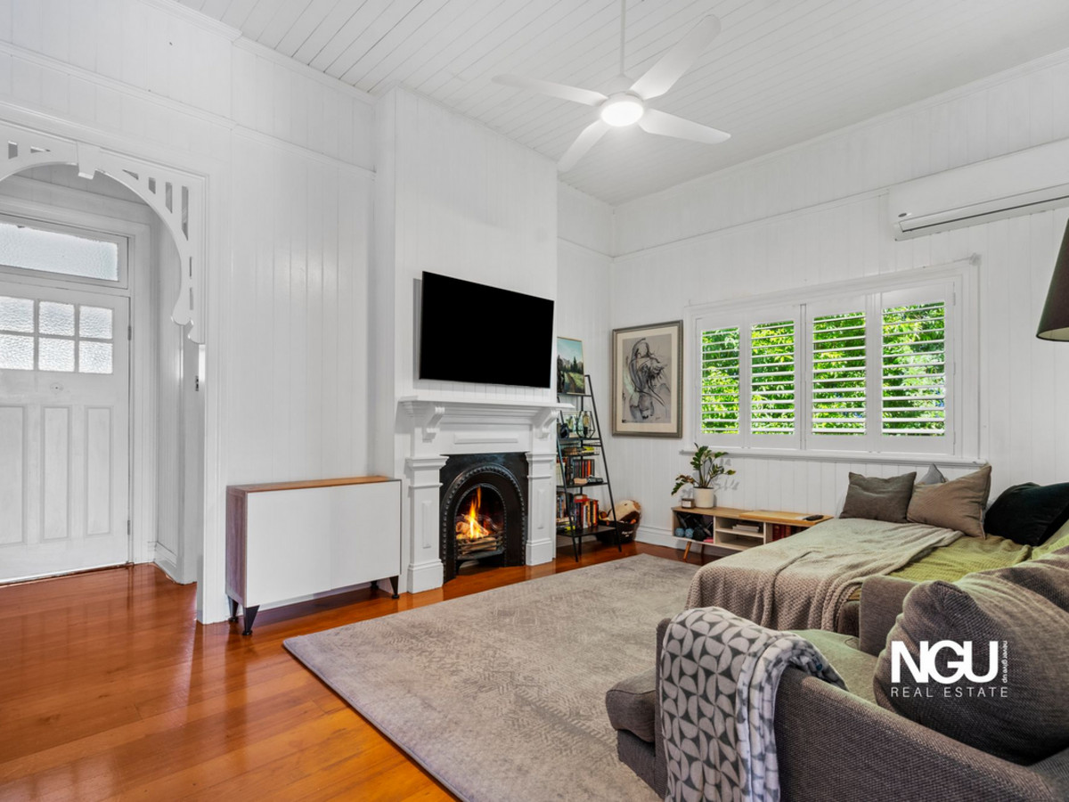 Inside, hallmark period features abound – soaring VJ walls and ceilings, polished timber floors and magnificent timber arches that define the craftsmanship of a bygone era. The air-conditioned living room welcomes you with a stunning timber mantel framing a fireplace (nonfunctional), creating a visually striking centrepiece and a cosy space for gathering with family and friends.