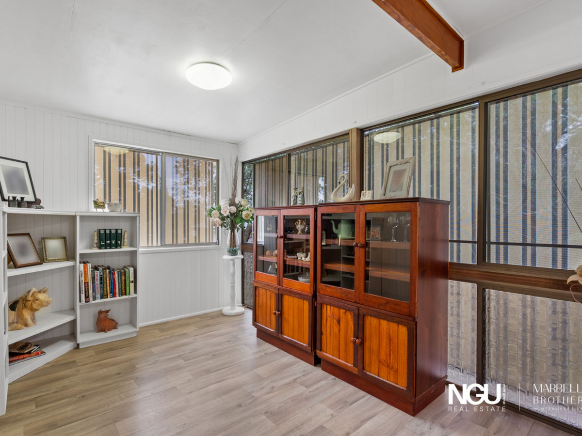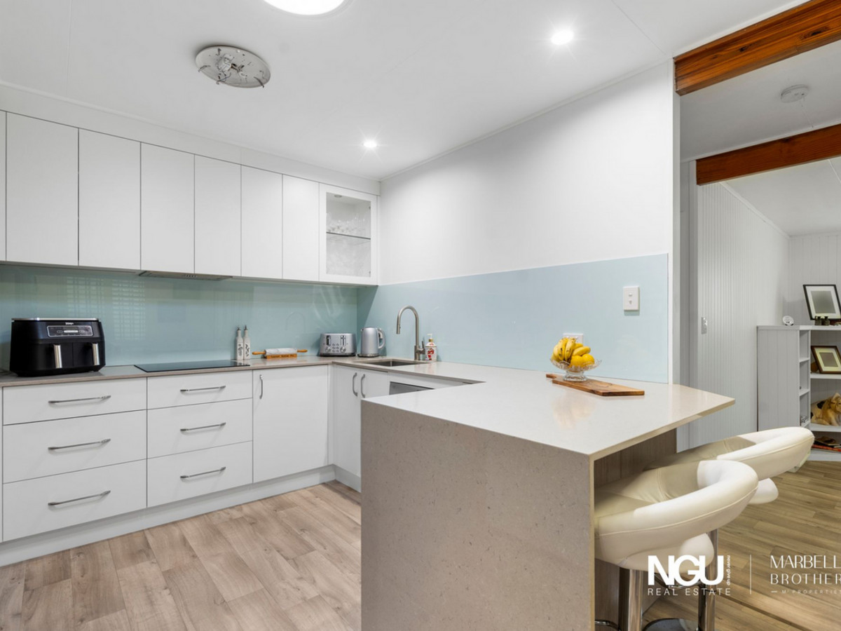 The kitchen has been stylishly renovated with a modern palette and quality inclusions throughout. Stone benchtops, soft-close cabinetry, overhead storage, and clever Lehman-style corner drawers make this space as functional as it is good looking. The layout flows easily into the dining area, front sitting room and built-in study nook – making it a true central hub for family living and entertaining.