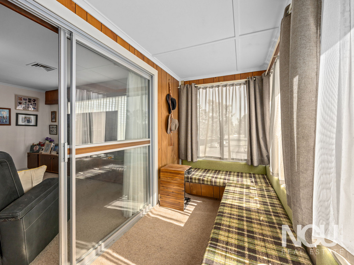 The spacious family bathroom is centrally located, complemented by a separate toilet for added convenience. The large kitchen boasts ample storage, gas cooking and a seamless connection to the adjoining dining area, which is big enough to host the entire family. From here, the home flows effortlessly into the expansive air-conditioned lounge room, where rich timber feature walls create a sense of timeless elegance.