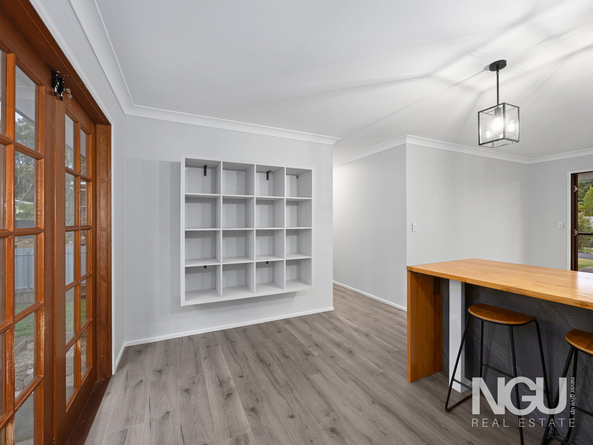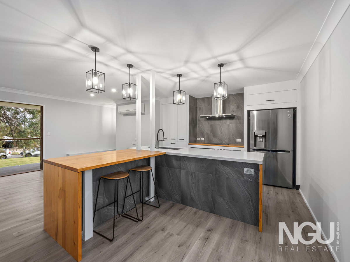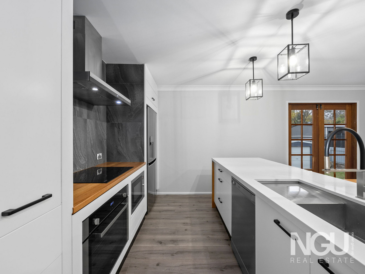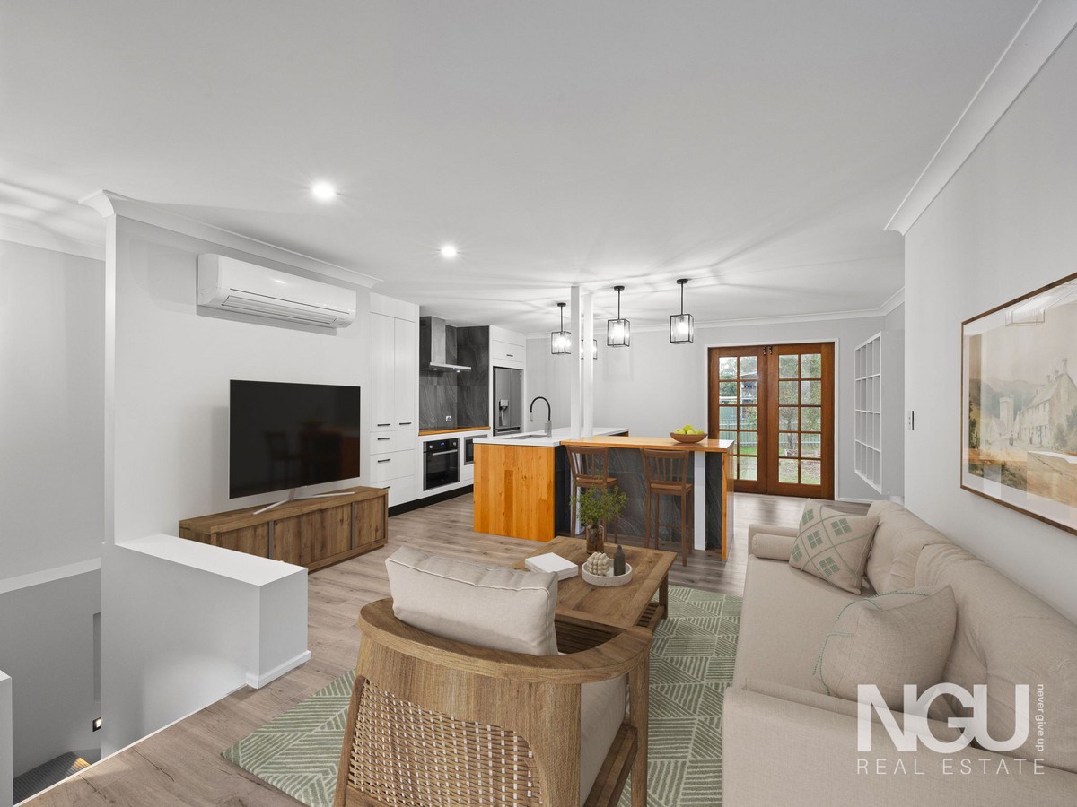 Upstairs, the heart of the home awaits. The air-conditioned living area with timber plank flooring flows into a stunning renovated kitchen showcasing stone bench tops, quality electric appliances, a dishwasher and plenty of storage. The clever integrated timber dining table creates a beautiful space for family meals and entertaining.