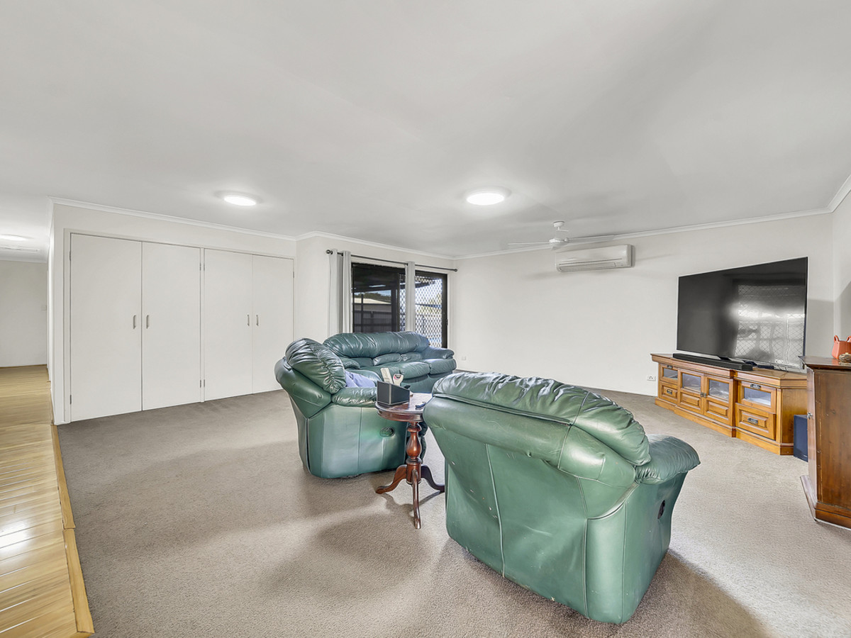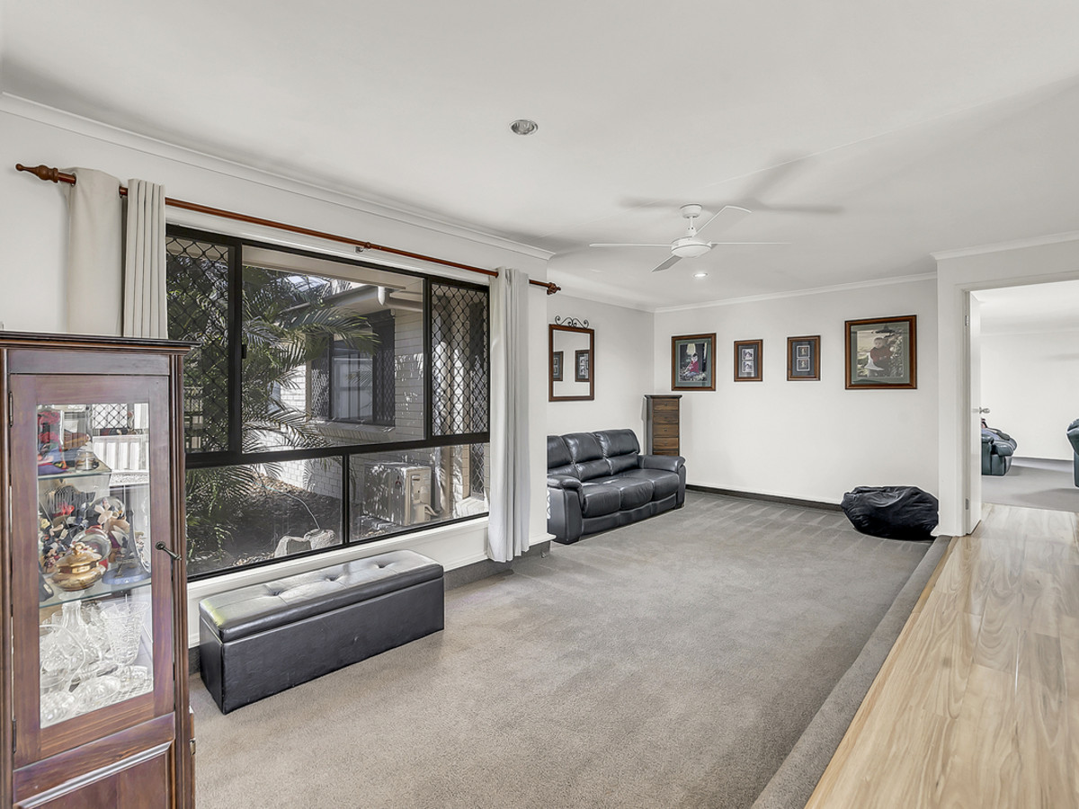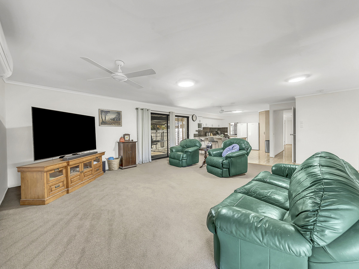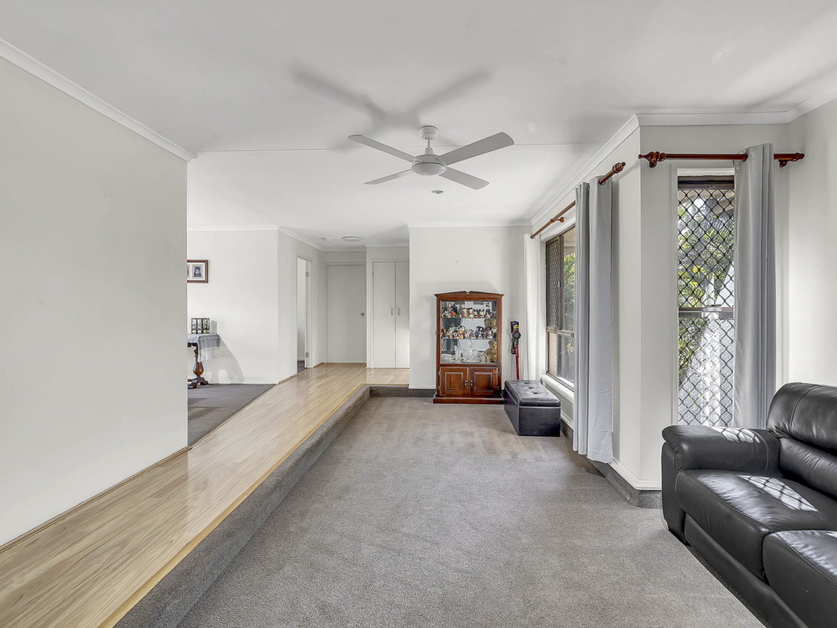 Living zones have been thoughtfully planned to cater to every occasion. A sunken lounge provides the perfect space to relax, while the expansive open-plan living area is both functional and inviting, with ceiling fans, air conditioning, and direct sliding door access to the double carport – ideal for unloading groceries with ease. The kitchen is a standout feature, oversized and designed to impress with generous bench space, abundant storage, a dishwasher, oven, stovetop, exhaust, double sink, and a convenient servery window connecting through to the separate formal dining room – making entertaining effortless.