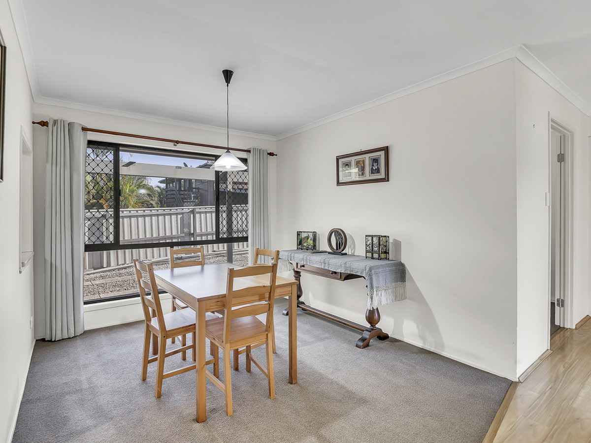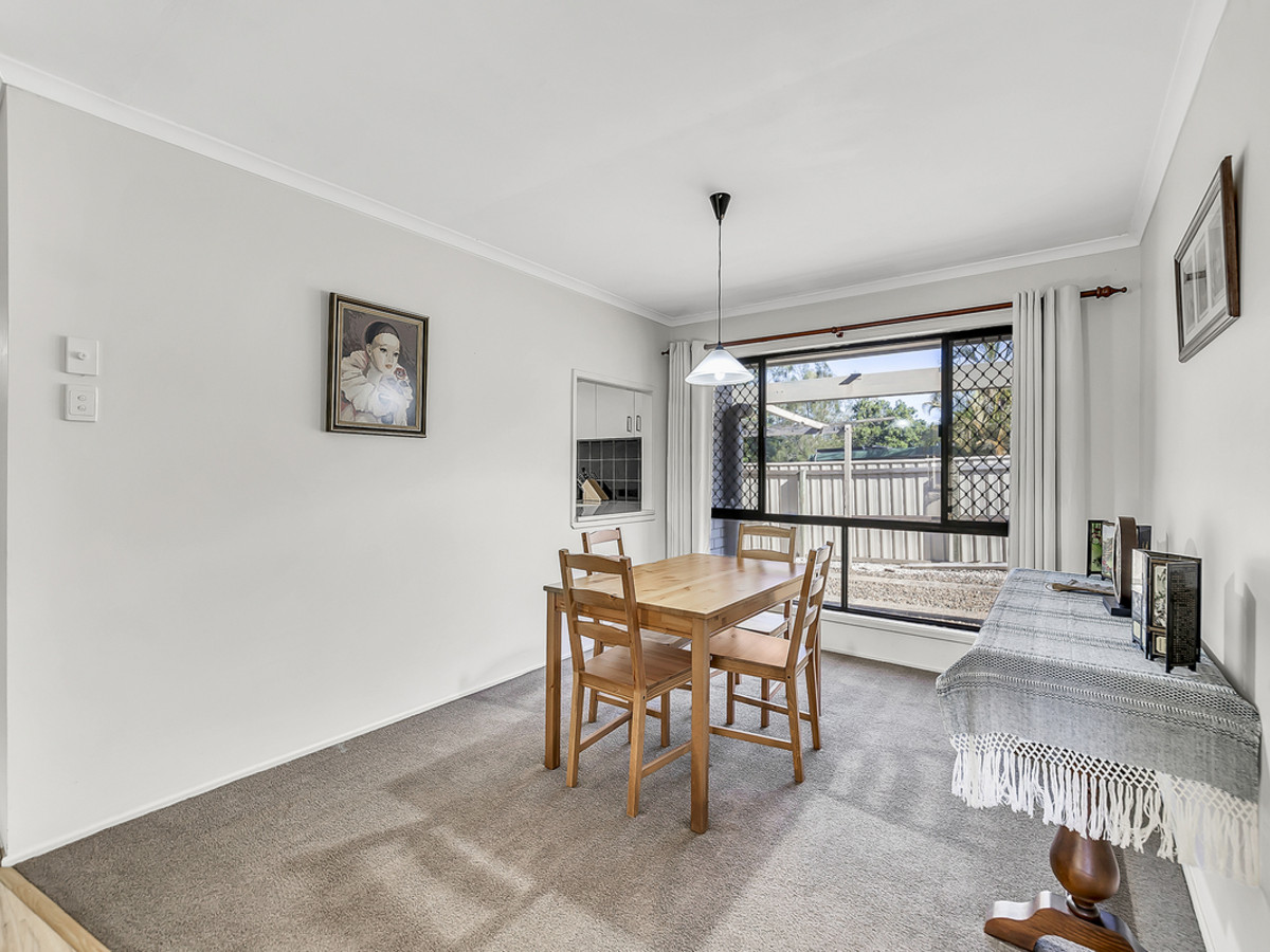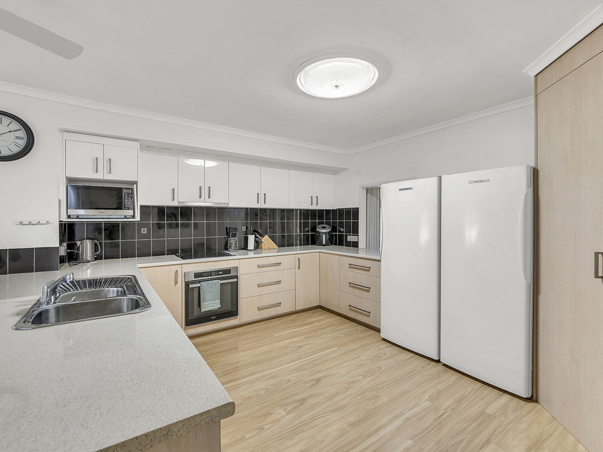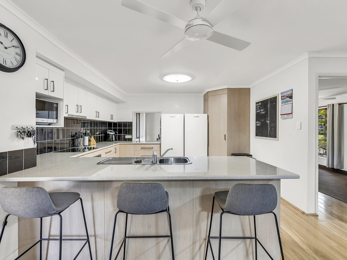 Living zones have been thoughtfully planned to cater to every occasion. A sunken lounge provides the perfect space to relax, while the expansive open-plan living area is both functional and inviting, with ceiling fans, air conditioning, and direct sliding door access to the double carport – ideal for unloading groceries with ease. The kitchen is a standout feature, oversized and designed to impress with generous bench space, abundant storage, a dishwasher, oven, stovetop, exhaust, double sink, and a convenient servery window connecting through to the separate formal dining room – making entertaining effortless.