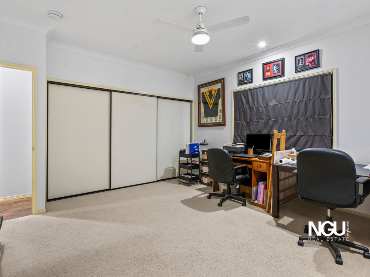Designed with generous proportions throughout, the home features a wide entry hall leading to the open-plan living spaces. The central living room and adjoining media room both offer large, versatile spaces to relax or entertain, while ducted air-conditioning and ceiling fans provide year-round comfort.
