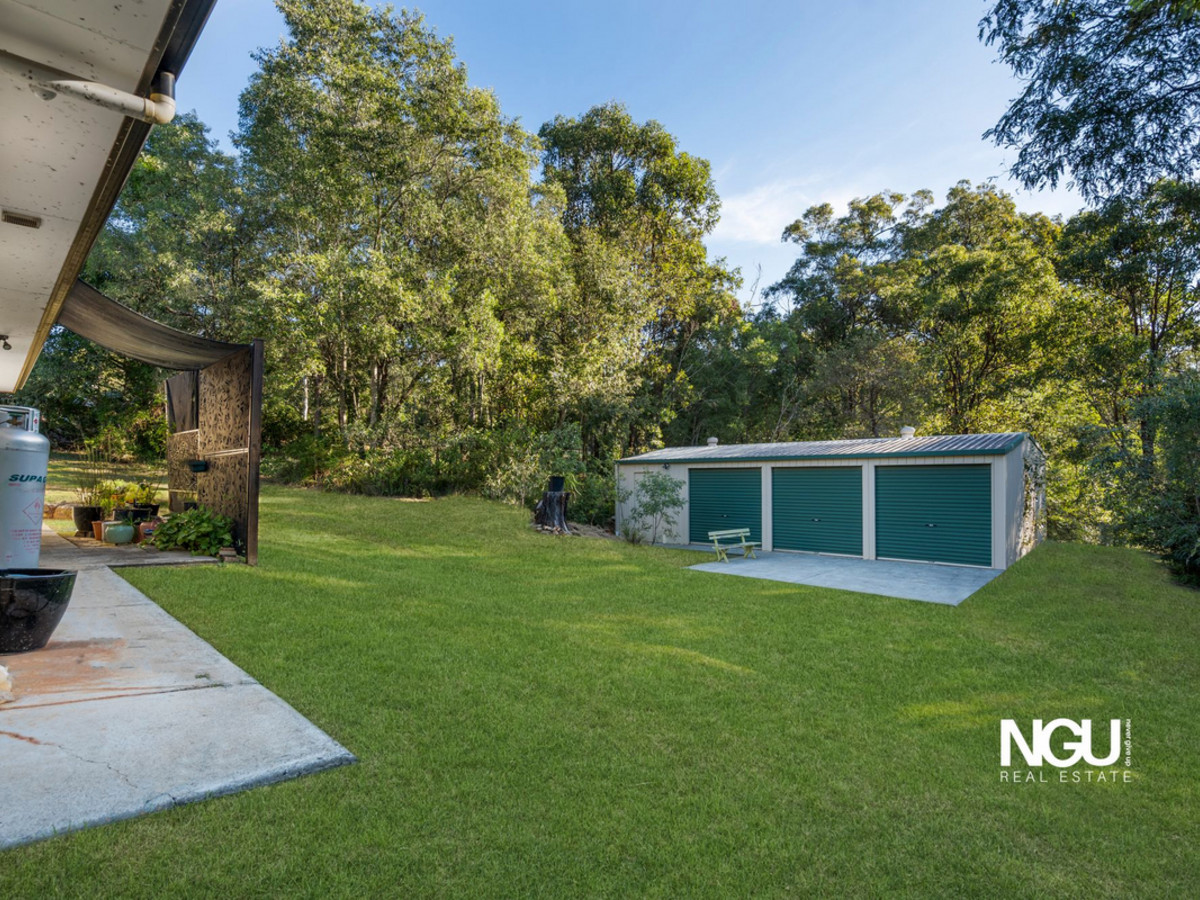 Step outside to the expansive covered patio—perfect for entertaining family and friends, or simply unwinding. Surrounded by established trees and greenery, this outdoor area offers true privacy and a calming outlook. While the immediate backyard is open and usable—ideal for kids, pets, or even a future pool—the remainder of the block transitions into natural bushland, creating a private buffer between you and the outside world. It’s the best of both worlds: a spacious home base with a serene, low-maintenance and secluded setting. A dam located at the rear adds a touch of rural charm, complementing the leafy environment and acreage lifestyle.