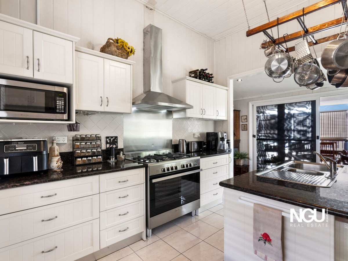 As you make your way up the front stairs, you’ll discover a covered patio, the perfect spot for enjoying a morning coffee. Upon entering, you’ll discover four spacious bedrooms, each bathed in natural light. The home’s character is further enhanced by beautifully polished timber floors and stunning VJ panel walls, creating a sense of timeless elegance.