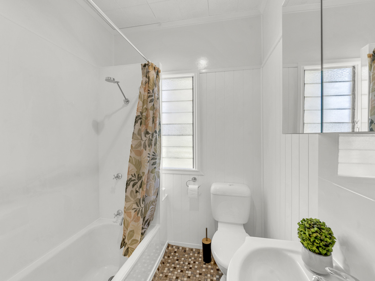 The master bedroom is a standout, offering air conditioning, a ceiling fan, and a full wall of built-in cupboards, providing storage and comfort in equal measure. The remaining two bedrooms are well-sized and ideal for family, guests, or even a home office. The bathroom has been newly renovated and is beautifully styled, featuring a shower over bath to combine functionality with modern appeal.