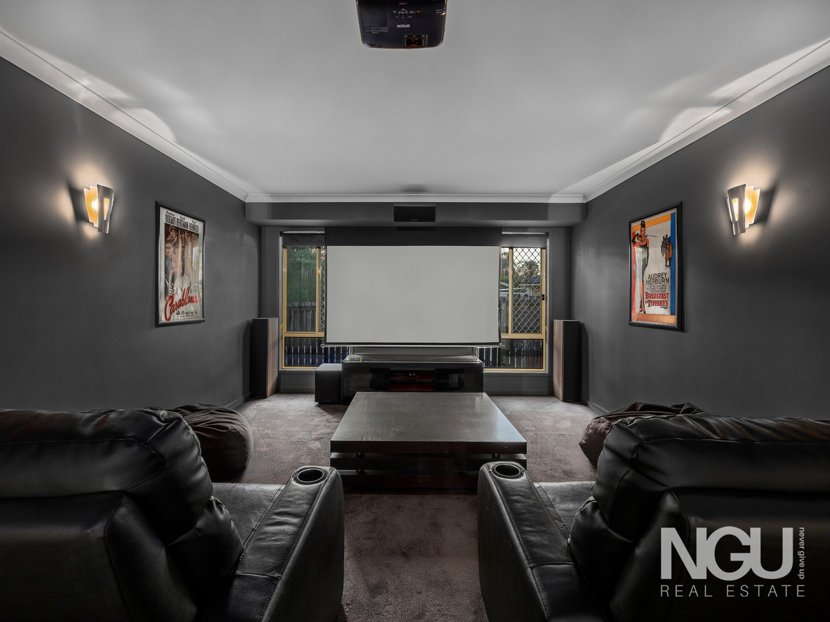 From the moment you step inside, you’re greeted with a sense of scale and versatility. Designed to accommodate growing families and entertainers alike, the layout boasts four separate living zones – a formal lounge, a dedicated kids’ retreat, a main lounge off the kitchen, and a fully equipped cinema room ready for movie nights in complete comfort. A full-size home office ensures you can work from home with ease and privacy.
