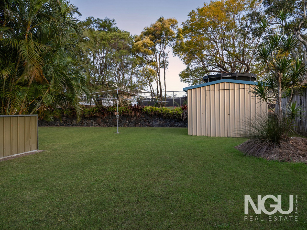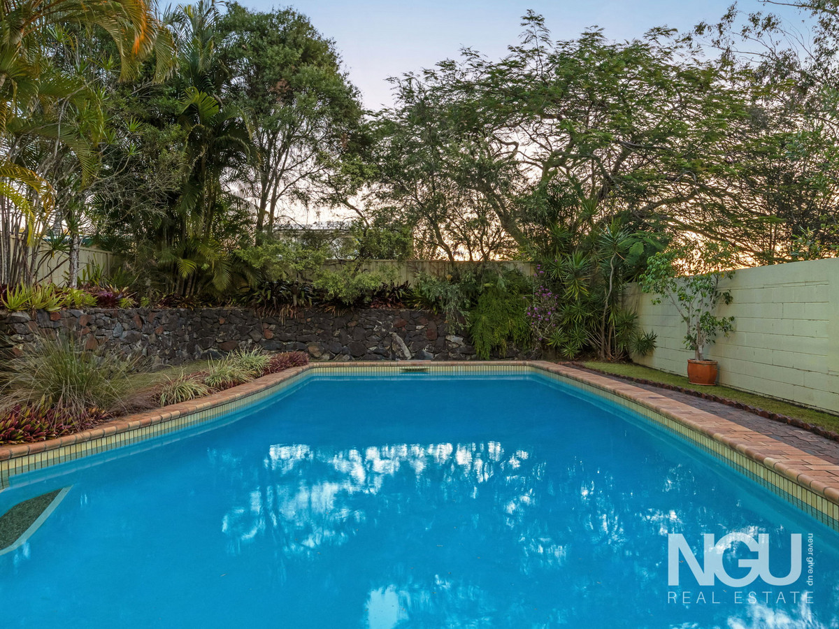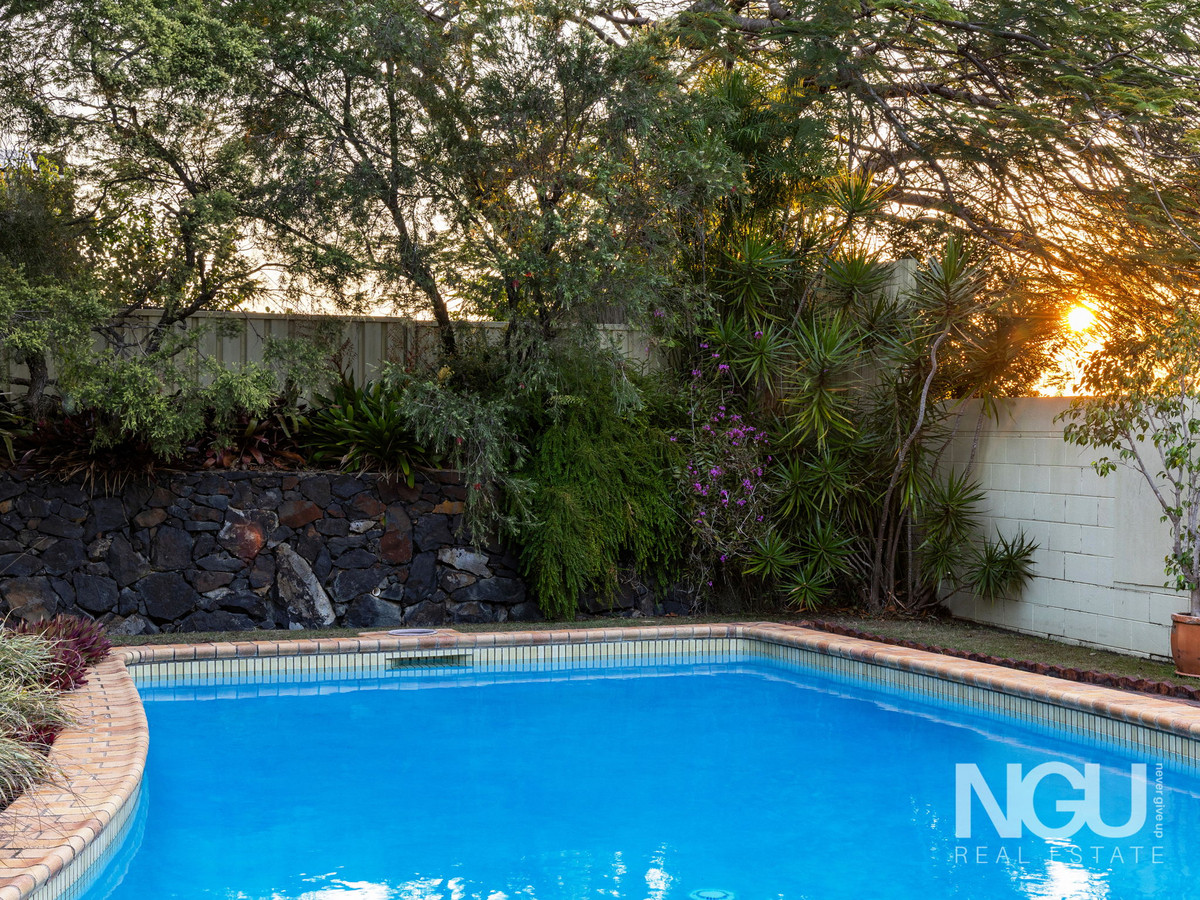 Outside, the property offers plenty of grassed yard space for kids and pets to play freely with the addition of a garden shed, while still allowing plenty of space for further additions. The large, crystal-clear in-ground pool is framed by established, low-maintenance gardens and a striking rock wall feature, ensuring a tranquil and secluded atmosphere.