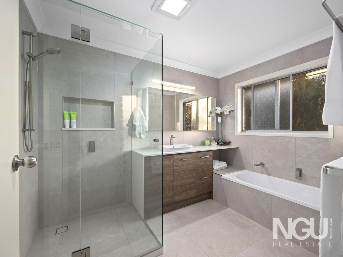 This upper level houses five bedrooms, each featuring excellent proportions, carpeted floors, ceiling fans and ample storage with built-in robes. These rooms are serviced by the main bathroom, which has been elegantly and completely renovated to the highest standard. With floor-to-ceiling tiles, a frameless glass walk-in shower, a modern vanity with sleek stone bench tops and a luxurious soaking tub, this stunning space offers a tantalising glimpse into the incredible potential this solid home holds for further cosmetic updates.