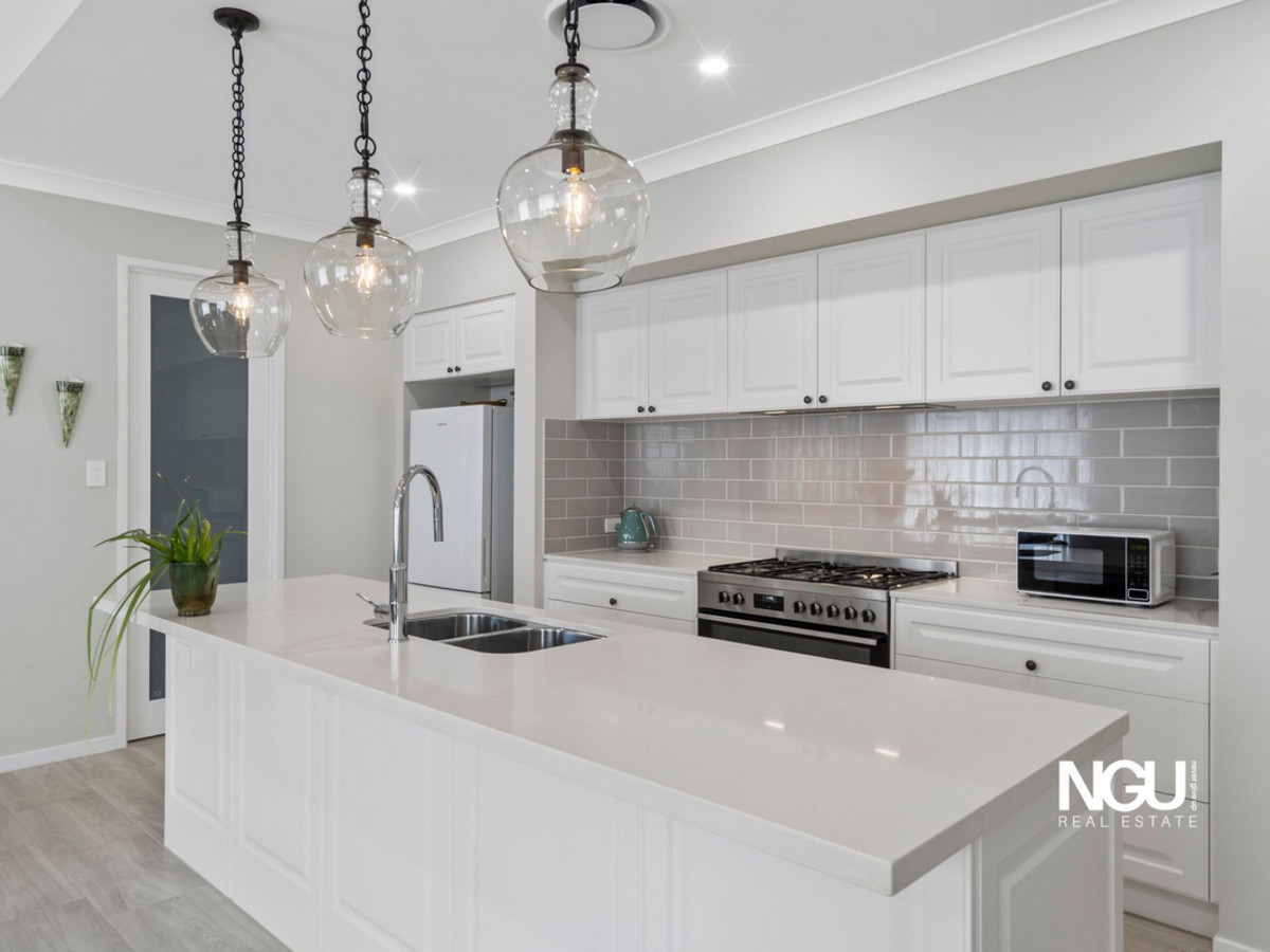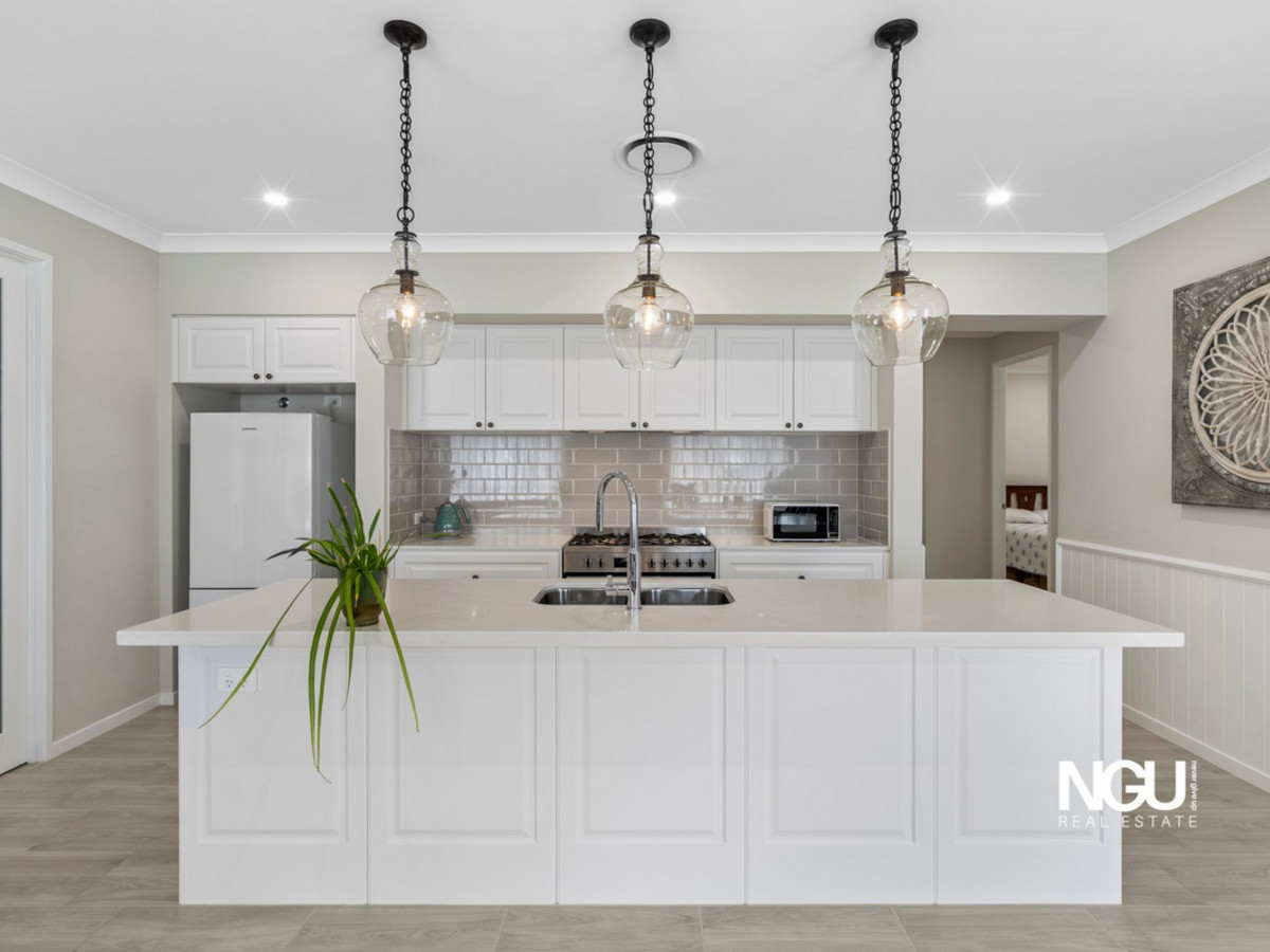 As with all good homes the designer look kitchen that boasts stone benchtops, a 900mm dual fuel freestanding oven/cooktop with double sink and a dishwasher. The kitchen is centrally located between the three (3) totally separate indoor living areas and also overlooks the oversized alfresco pergola and manicured 521m2 block.