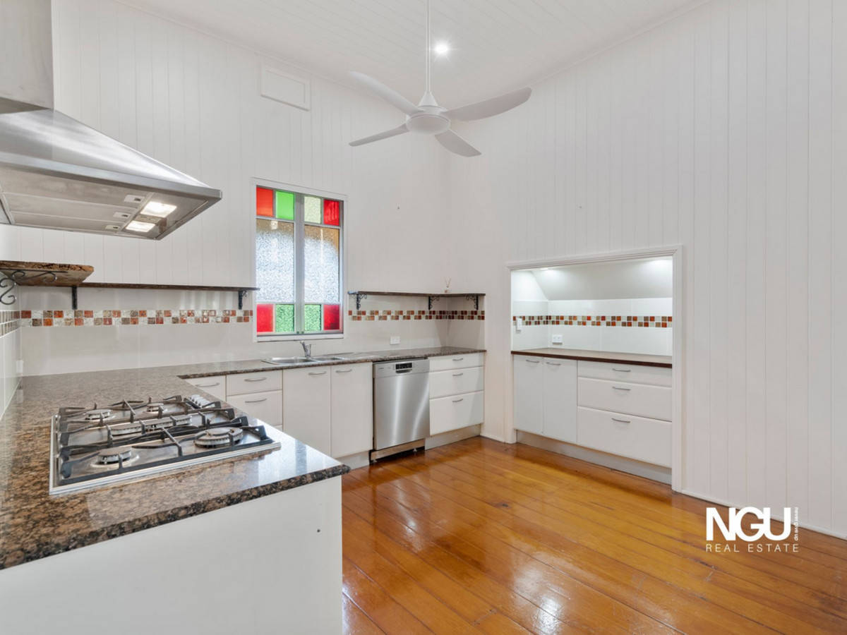 Behind its charming façade, you’ll discover freshly recoated hardwood floors, soaring ceilings, and original French doors opening to a stunning wraparound verandah. The modern kitchen, installed in 2018, features granite bench-tops, gas cooking, a walk-in pantry, and a cleverly designed coffee nook that pays homage to the home’s original architecture. The open-plan living and dining area is light-filled and air-conditioned, creating a welcoming hub for family gatherings.
