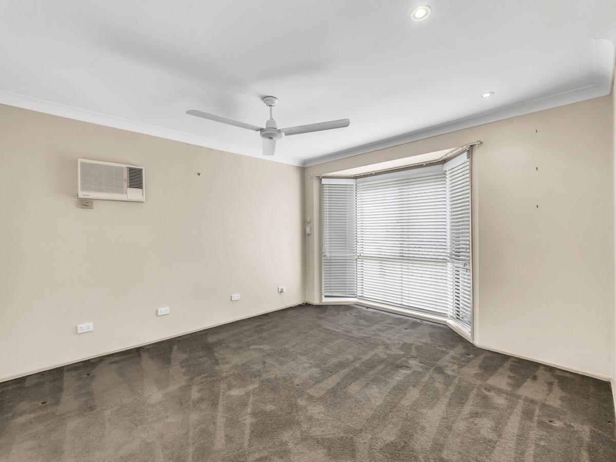 The formal lounge is equally inviting, with carpet underfoot, air conditioning, a ceiling fan, and plenty of room to unwind. Down the hallway are three additional bedrooms, all fitted with carpet, built-in wardrobes, and their own air conditioning units for year-round comfort. Bedroom four is particularly unique with its own two-way bathroom, effectively functioning as a private ensuite while still servicing the rest of the home. The bathroom is thoughtfully designed with a shower, vanity, toilet, and extra storage on entry.