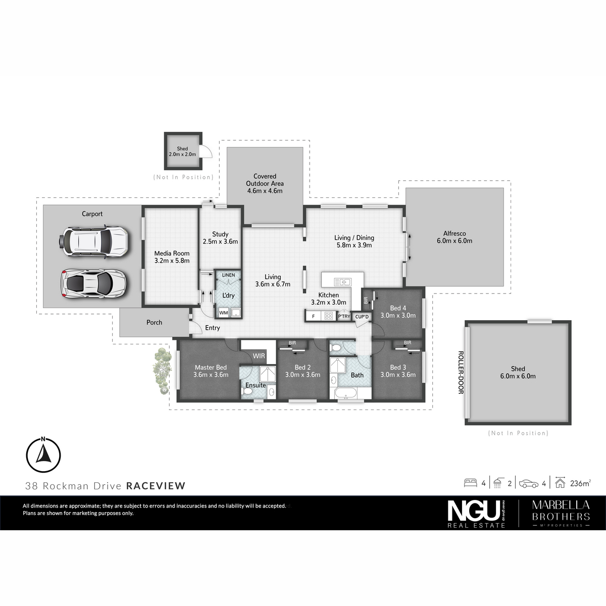 At the front of the home, the dedicated media room offers the perfect space for a kids’ retreat, home theatre or additional living area, while the separate home office provides flexibility for those working remotely or easily adapts into a fifth bedroom option if desired. The home also boasts a powered double shed offering valuable extra space for storage, workshop, hobbies or additional vehicle accommodation.