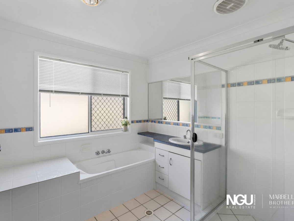 The main bathroom is well-appointed, featuring a full bathtub, separate shower, excellent vanity storage and plenty of natural light – ideal for growing families or guests.