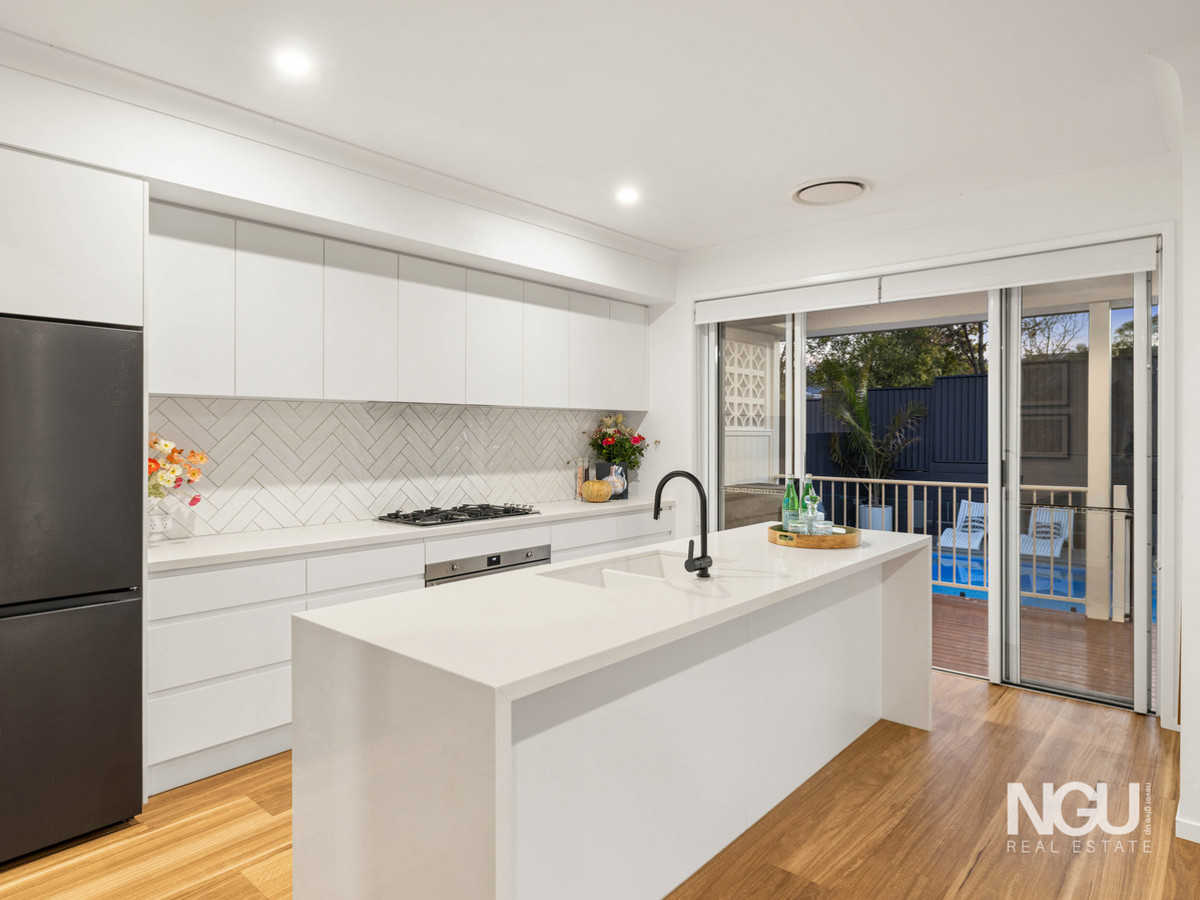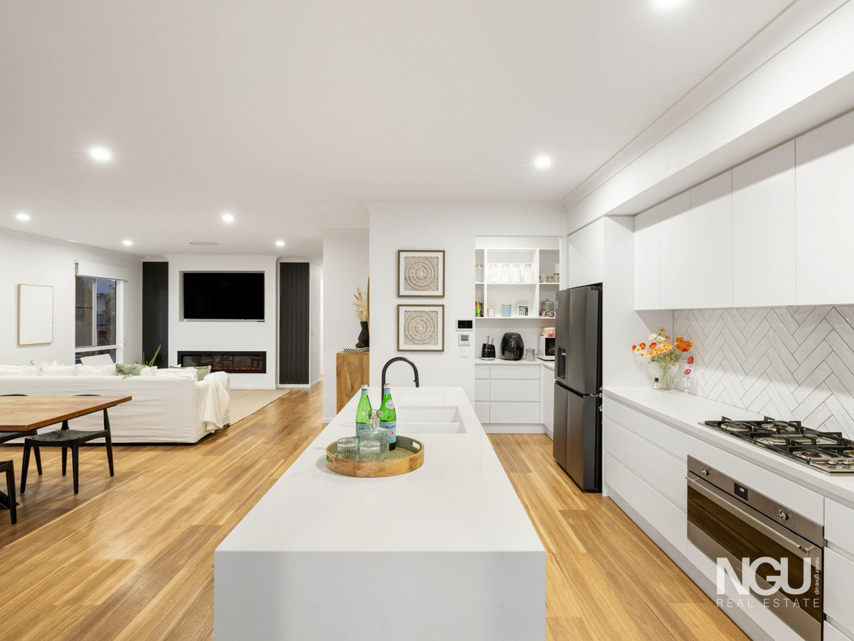A Galley-style layout features 40mm stone waterfalls and large walk in pantry