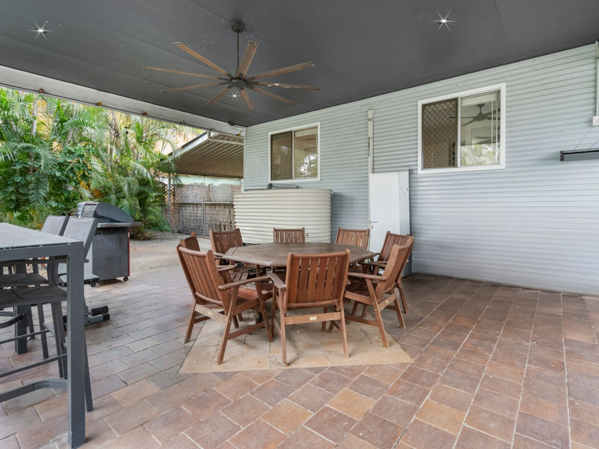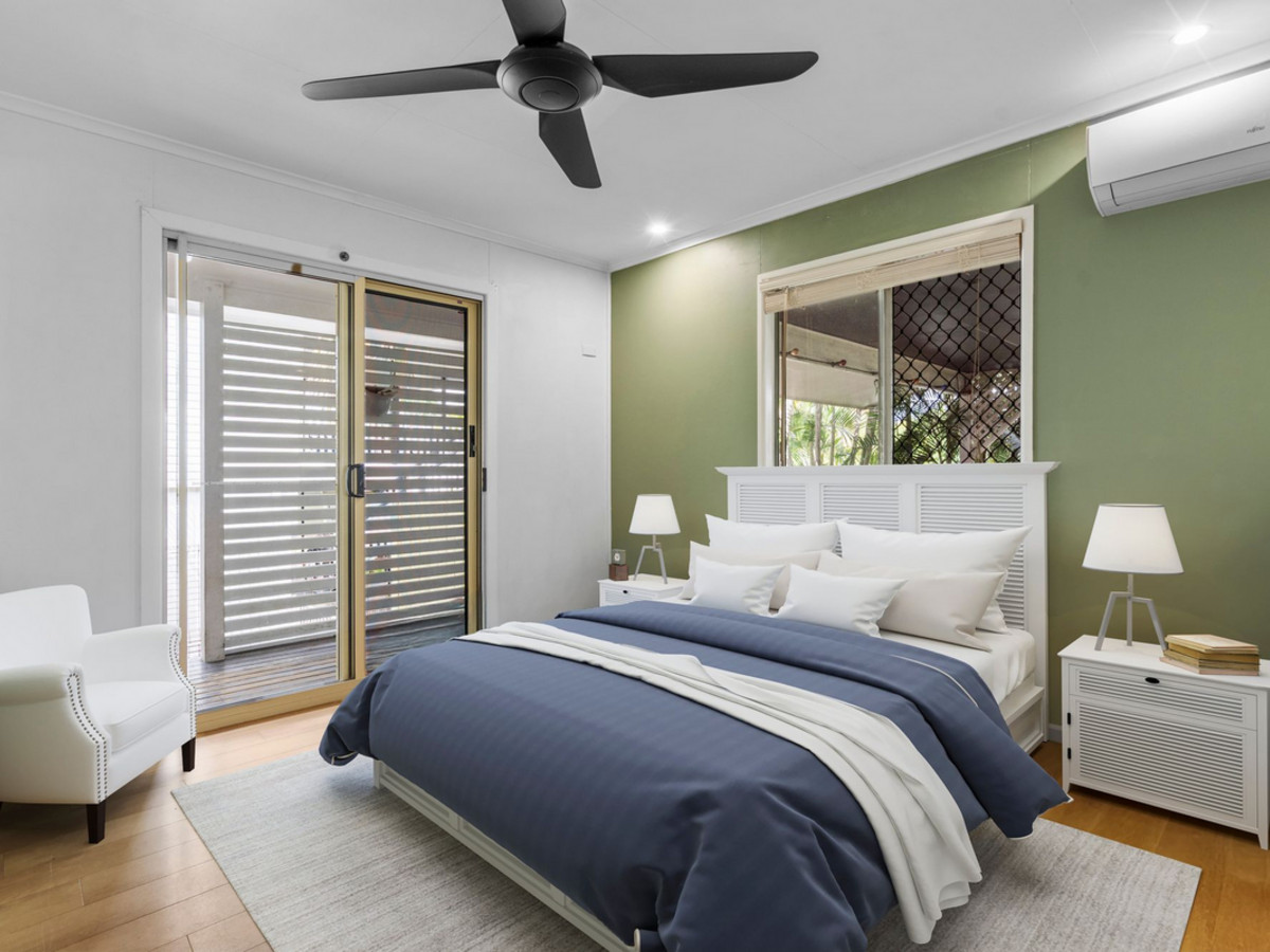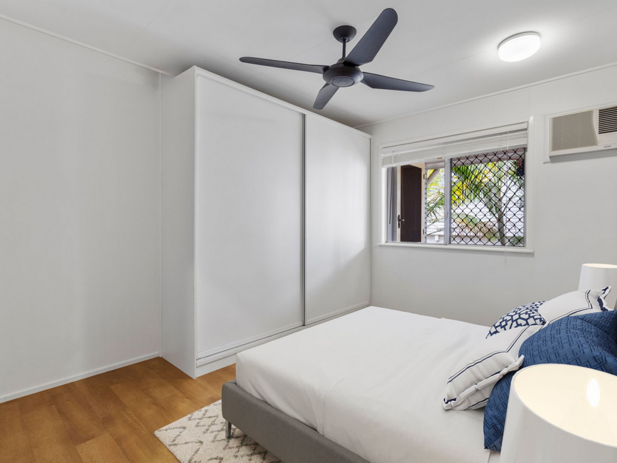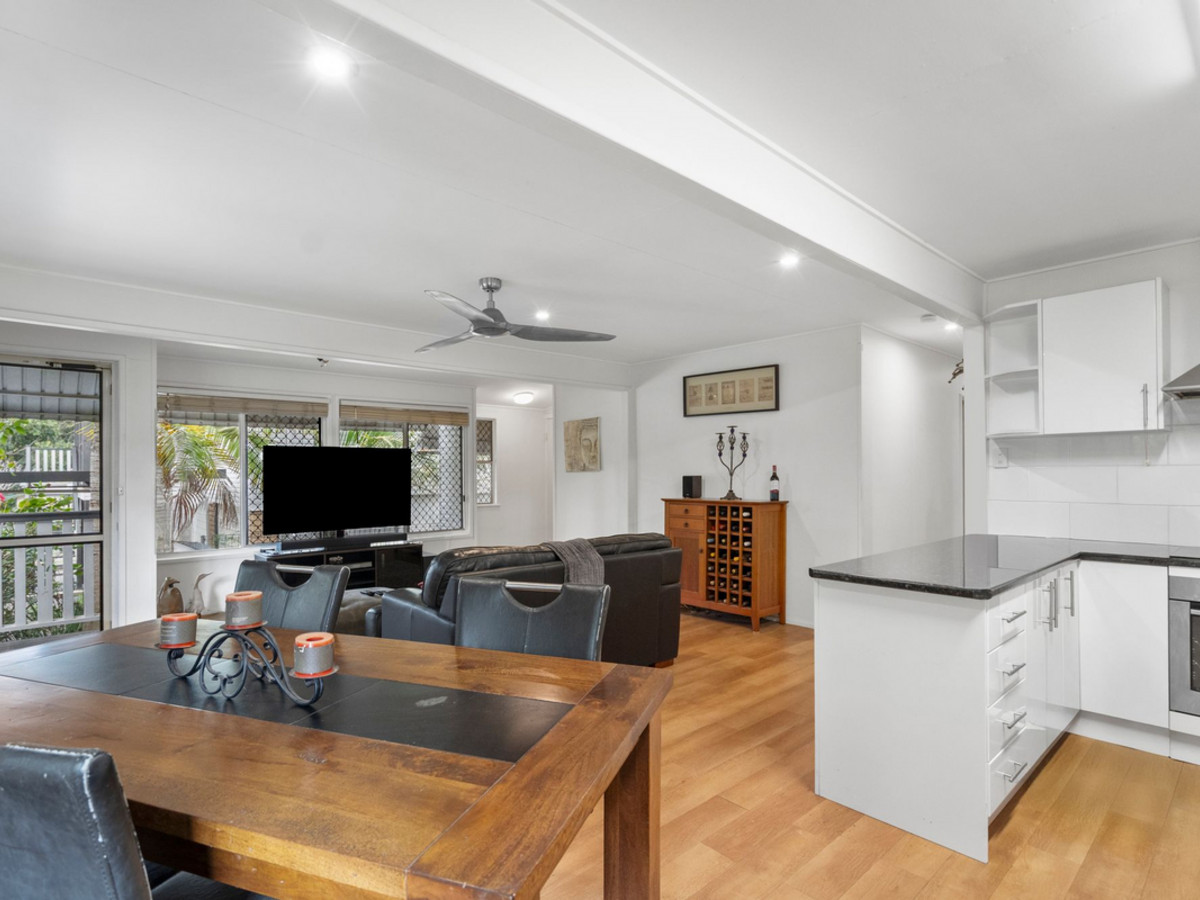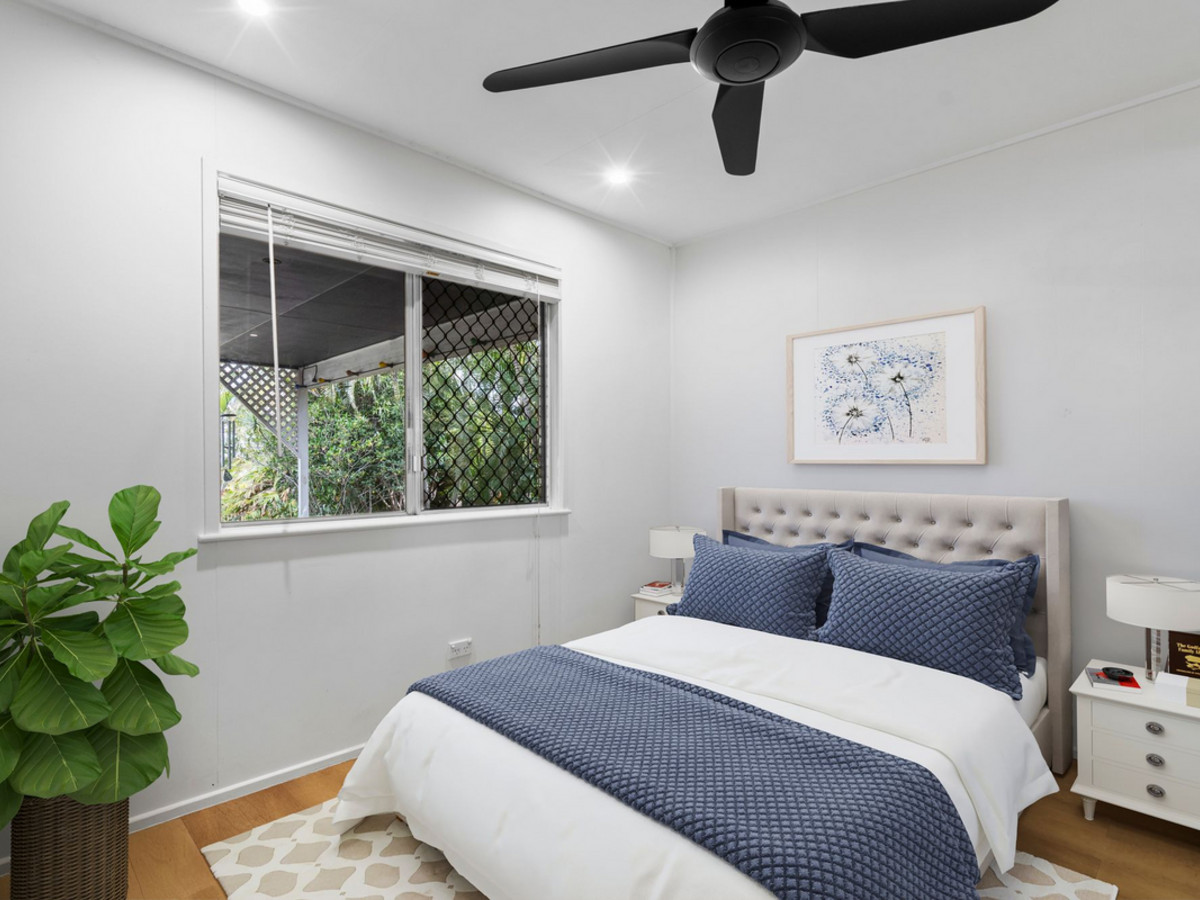 Flowing from the main living zone are three well-appointed bedrooms—all with ceiling fans, built-in robes, and security screens. Two include air-conditioning, while the master also enjoys private access to the veranda, adding to its lifestyle appeal.