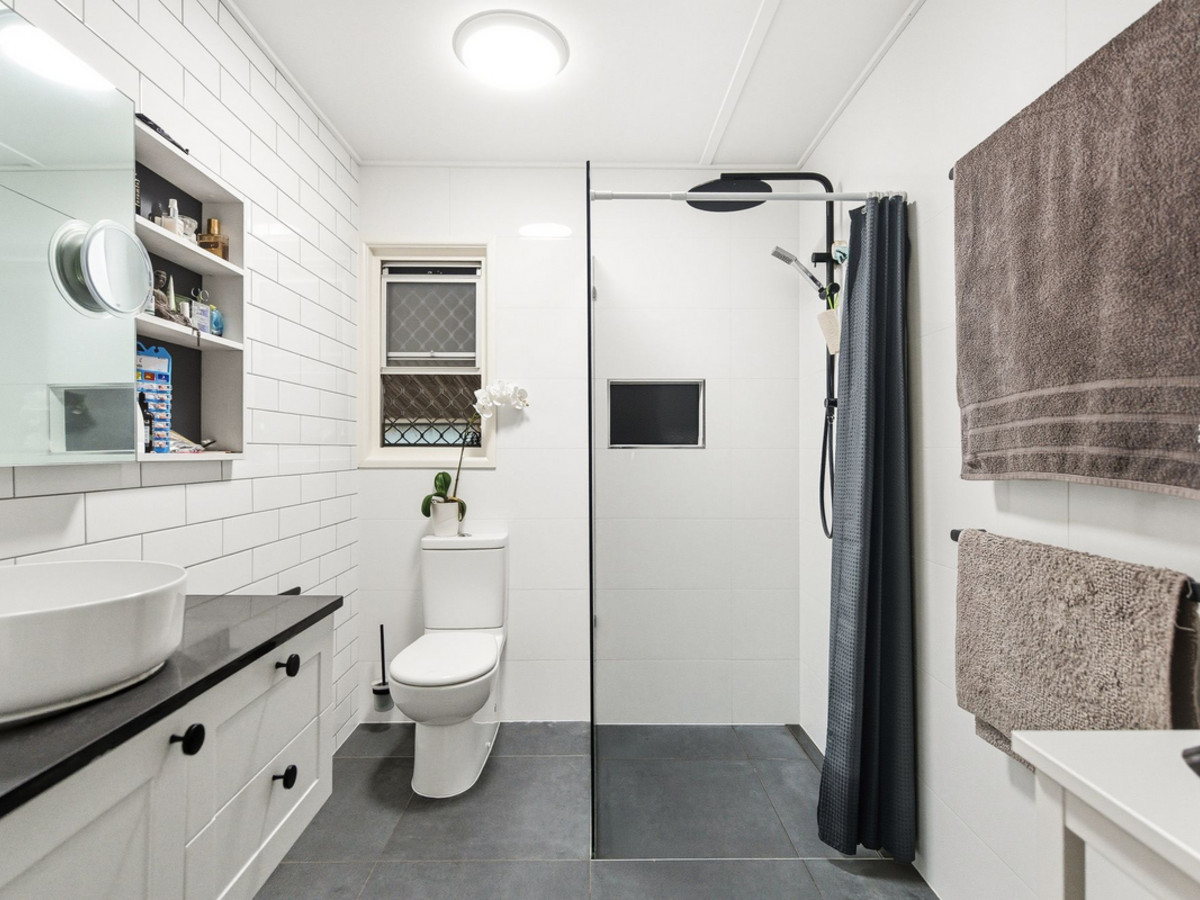 The bathroom, upgraded just five years ago, showcases heated towel rails and an IXL heater for everyday luxury. A newly designed galley-style laundry offers excellent bench space and storage, while skylights, hybrid flooring, Venetian shutters, and Crimsafe security screens throughout elevate the home’s modern, bright, and secure feel.