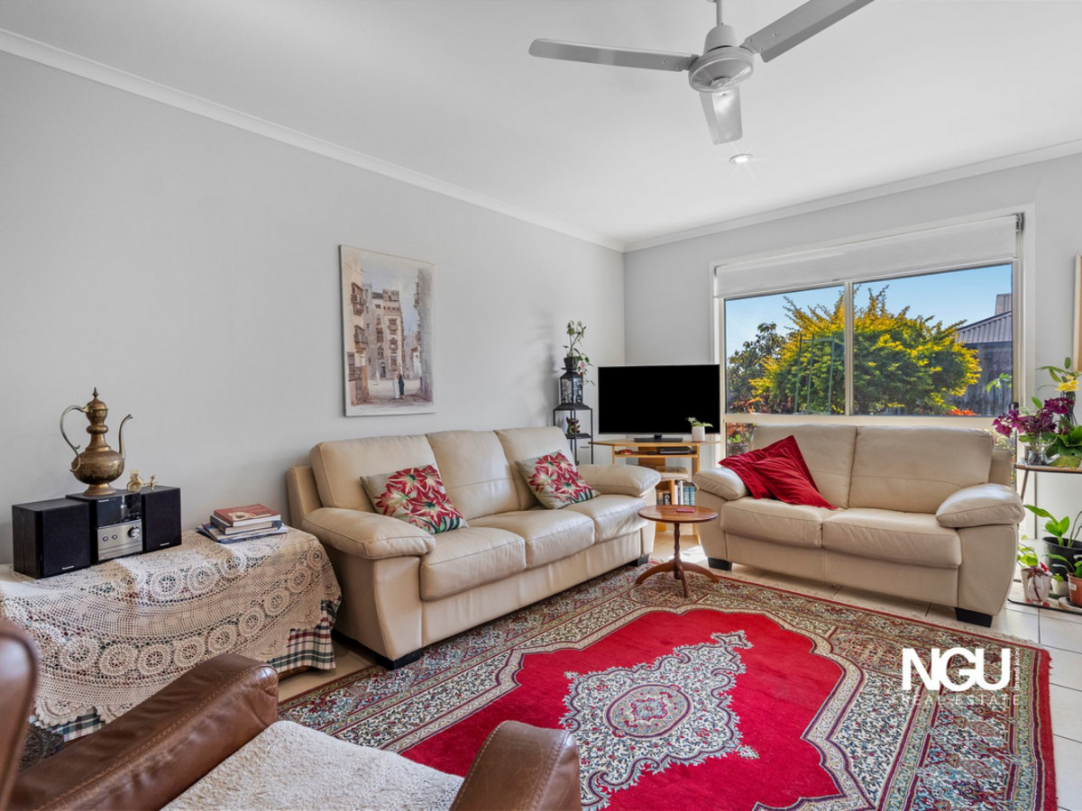 Connected seamlessly to the kitchen is a large open planned lounge and dining room with a ceiling fan, creating a versatile space that is ideal for both everyday living and entertaining guests.