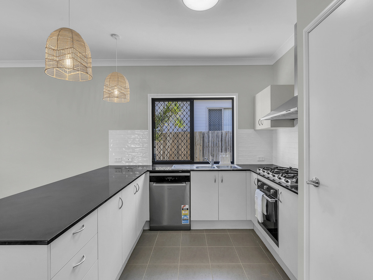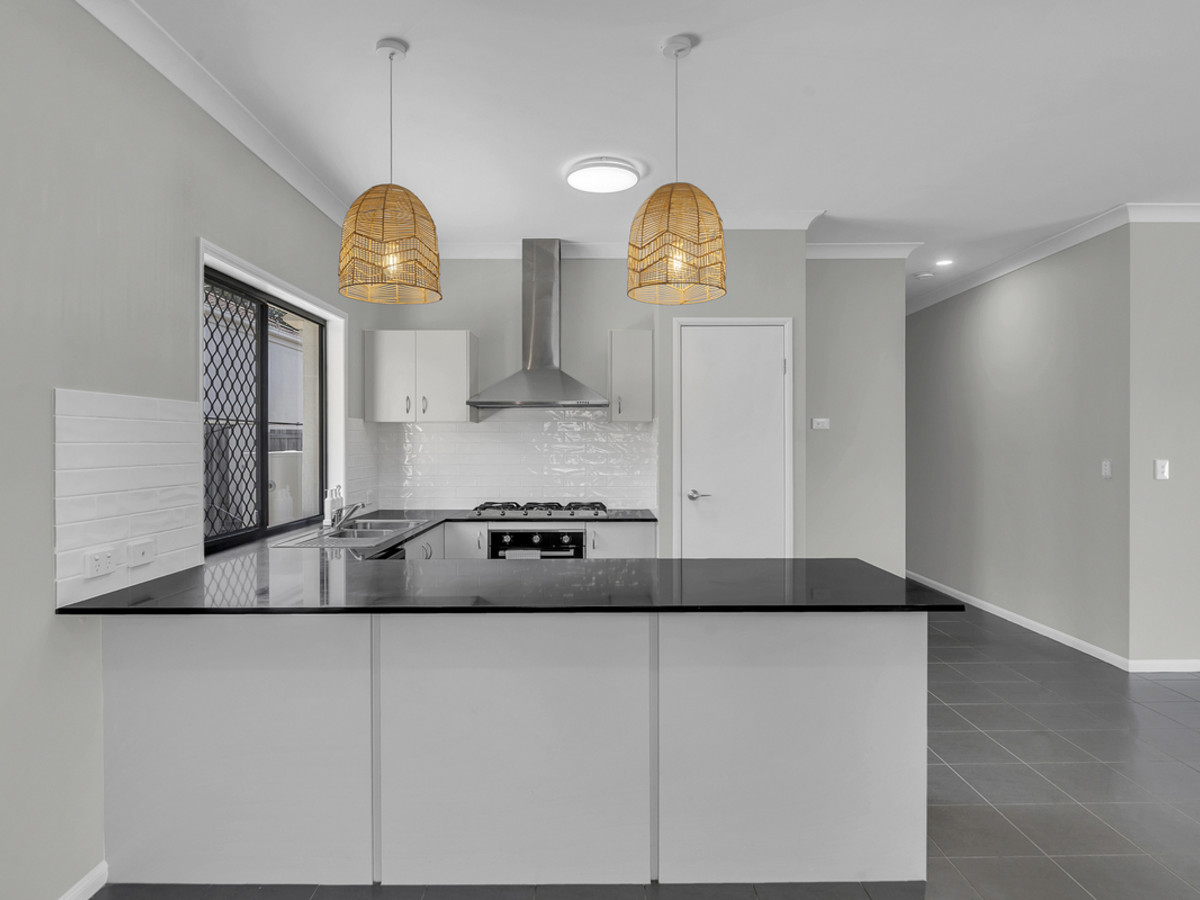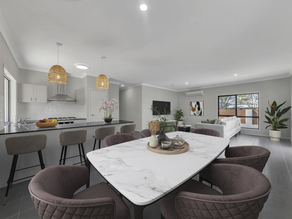 The heart of the home is the open-plan living and dining area where light, space, and comfort combine. The kitchen is an entertainer’s dream with stone benchtops, pendant lighting, a 5-burner gas stove, dishwasher, pantry, and loads of storage and bench space. The living and dining area is tiled, air conditioned, and flows seamlessly outside, making it the perfect spot for family gatherings or relaxed evenings at home.