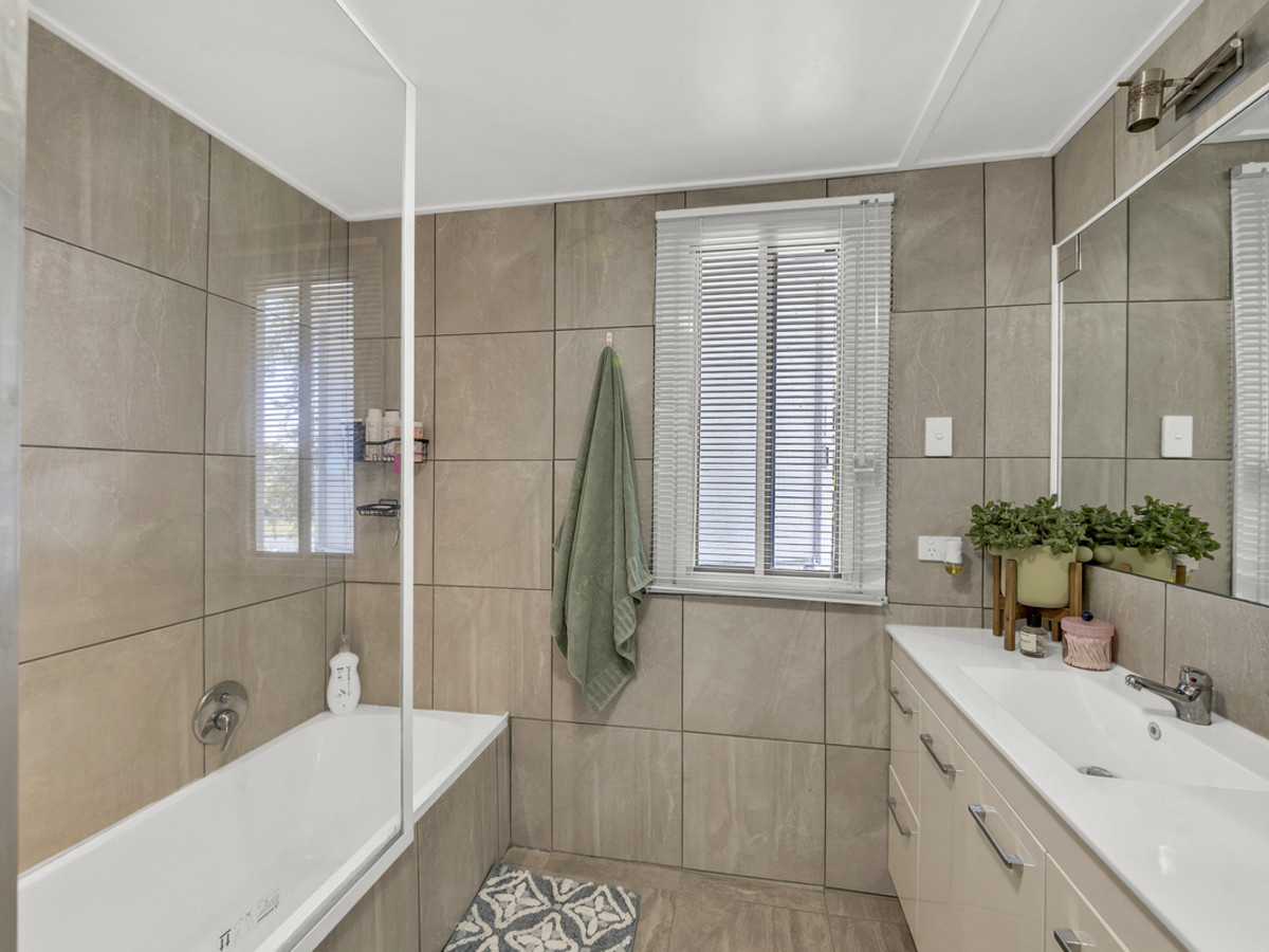The main bathroom continues the home’s thoughtful design, offering a spacious layout with a shower over bath, vanity, toilet, and plenty of built-in storage. The kitchen will delight any home chef, featuring an updated electric stove and rangehood, dishwasher, double sink, expansive bench space, and a generous pantry — perfectly blending functionality with timeless style. From here, step through to the separate dining area, which flows seamlessly out to the stunning covered back patio. Complete with lights and power, this is the ultimate spot to entertain friends and family while overlooking the lush, manicured gardens.